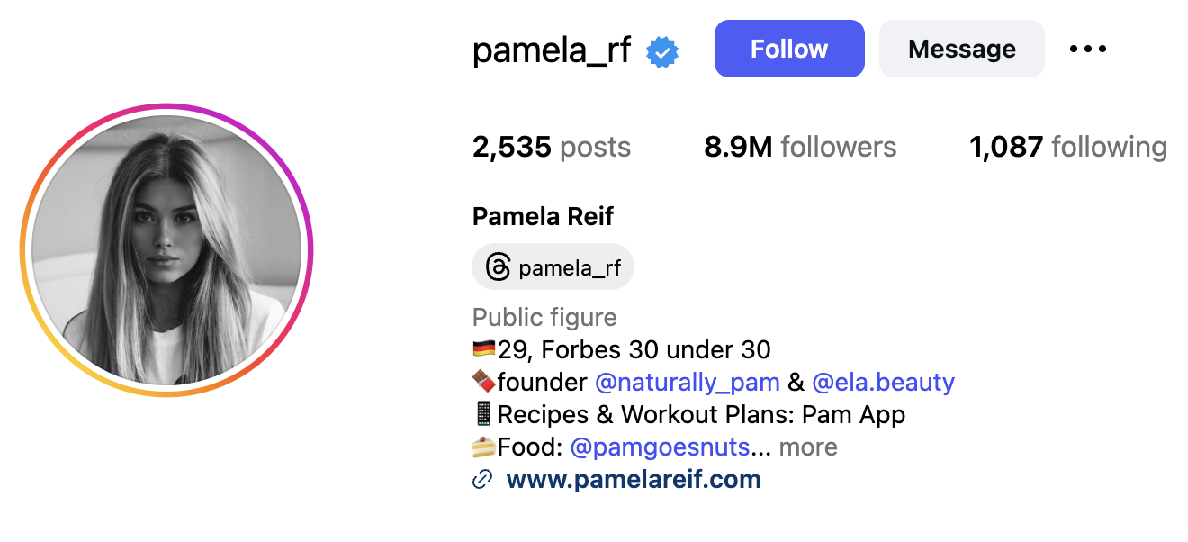 15. Pamela Reif - @pamela_rf - 9M+ followers